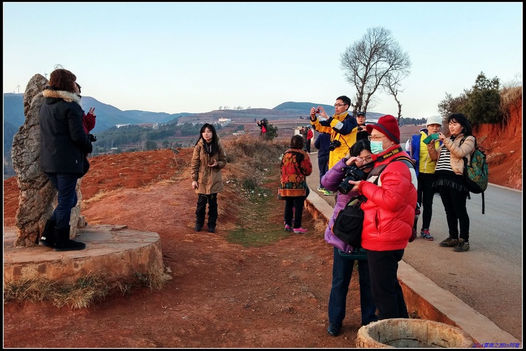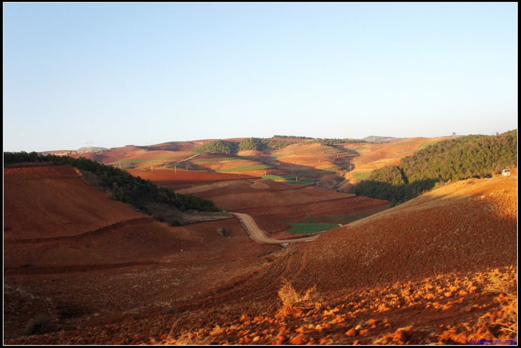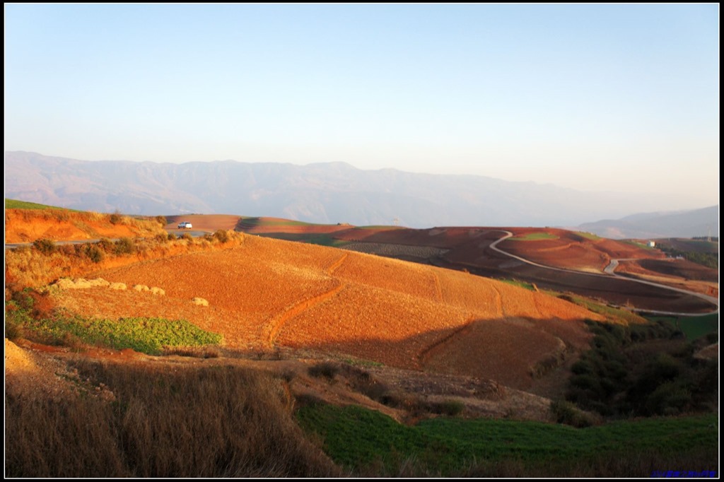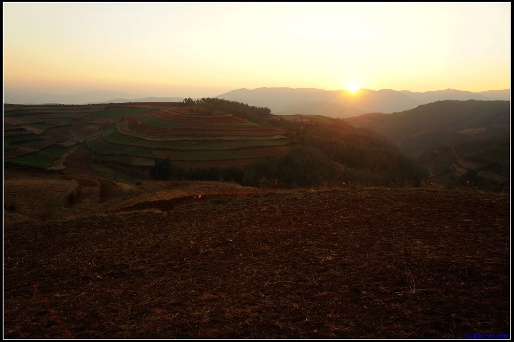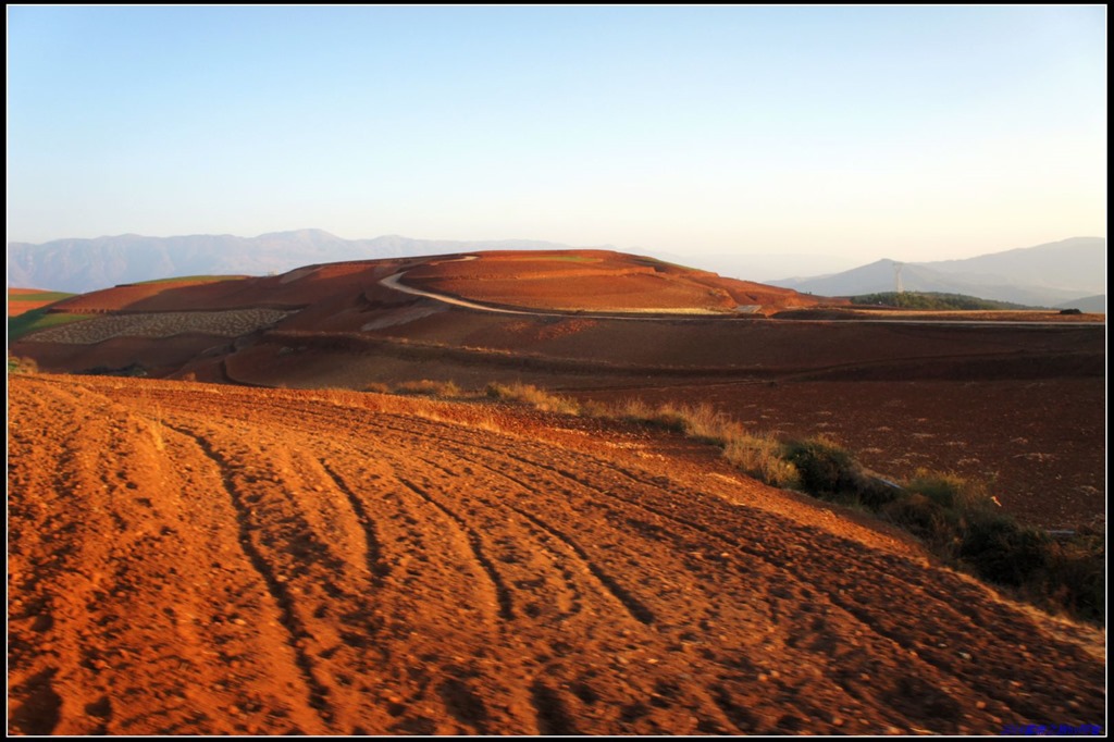 我們在元謀窯洞賓館用畢午餐後,先驅車返回昆明外圍,再從35縣道前往東川紅土地,沿途山路蜿蜒崎嶇,約傍晚18:00才抵達東川紅土地之「螺絲灣」,經短暫停留觀賞後,即續往「瓦梁房子」、「樂譜凹」二景點,而此時正逢日落西山(約18:25),雖然景色秀麗,但因光線不足及逆光,拍照效果不易呈現視野所見,相當可惜。之後,我們入住2013年剛開幕之東川紅土印象賓館,房間簡潔乾淨,戶外還有露台,而今晚星光璀璨、銀河閃爍,我和小夢在露台上捕捉這片刻的美好,即趕快進入夢鄉,儲備明天早起觀賞日出的體力。