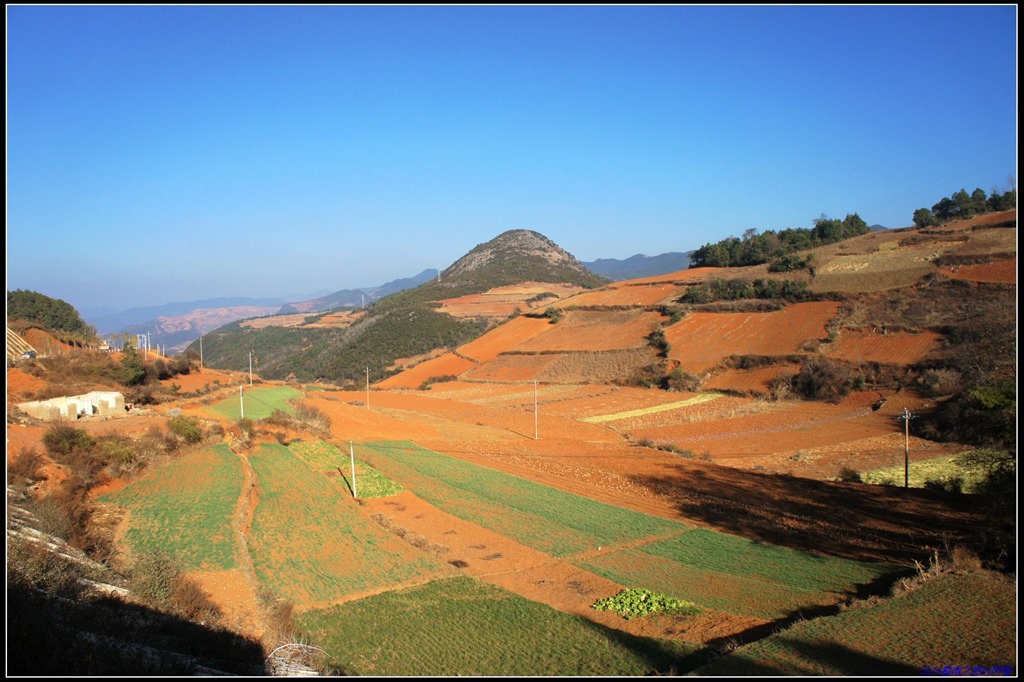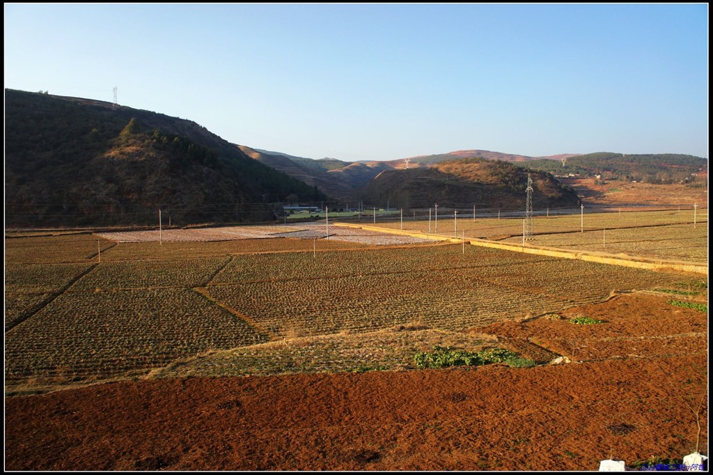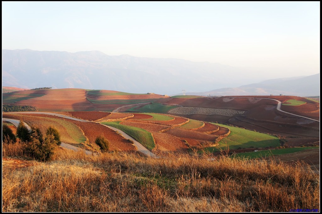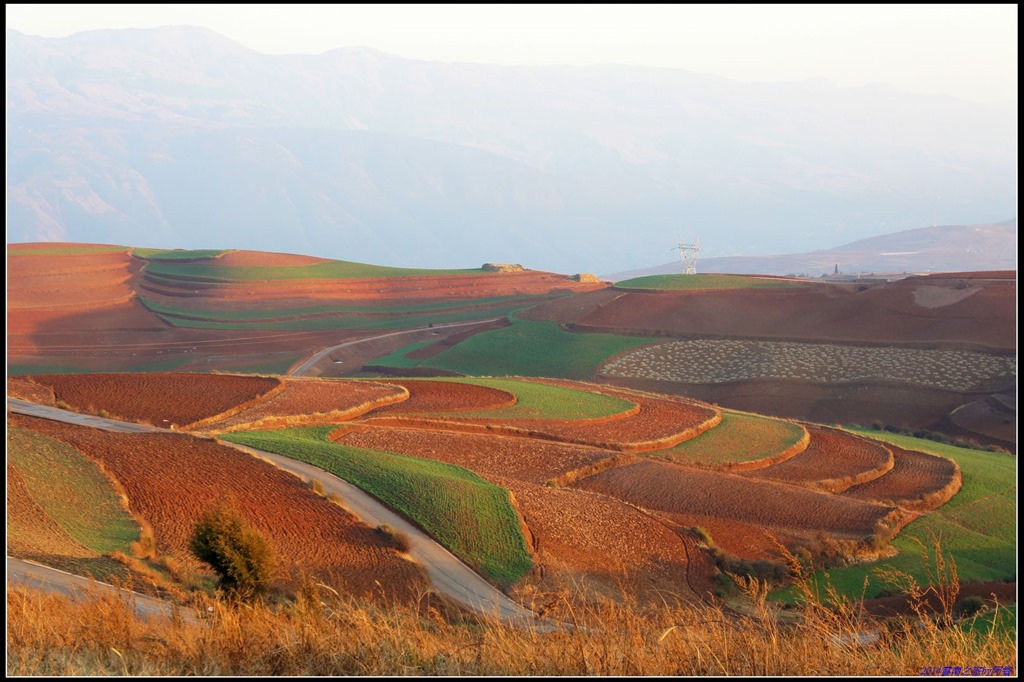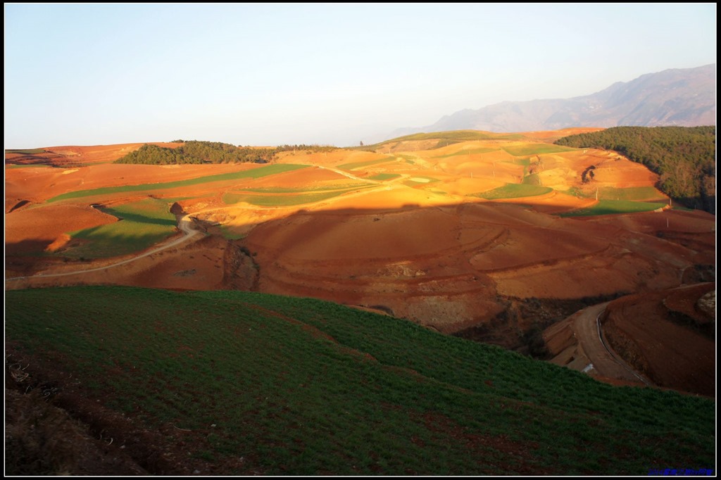 東川紅土地位於昆明市東川區新田鄉花溝村花石頭社方圓20公里左右之烏蒙山區,海拔在2000米至3000米之間,屬於高原丘陵地貌,因土壤富含氧化鐵等金屬元素,使得土地呈現罕見的赤紅色,而農民於不同季節,在連綿起伏、形狀不一、曲線和諧的層疊土地上,更替種植不同農作物,洋麥花、蕎子花、洋芋花、油菜花、蘿蔔花、玉米等依著時序成長綻放,形塑出斑爛交錯的絢麗色塊,在光與影的作用下,宛若上帝遺留人間的調色盤,非常具有人文自然之景觀價值,而造訪東川紅土地最佳時期為每年5月及11月中旬,我們1月造訪,大部分農作物均已收成,色彩就沒那麼豐富。