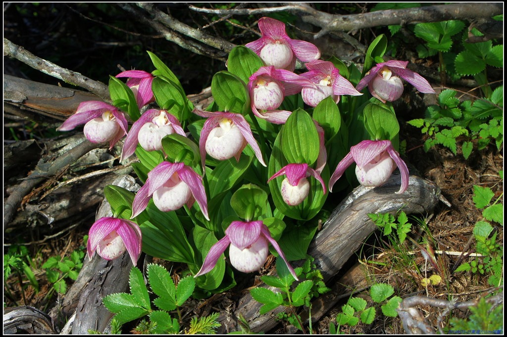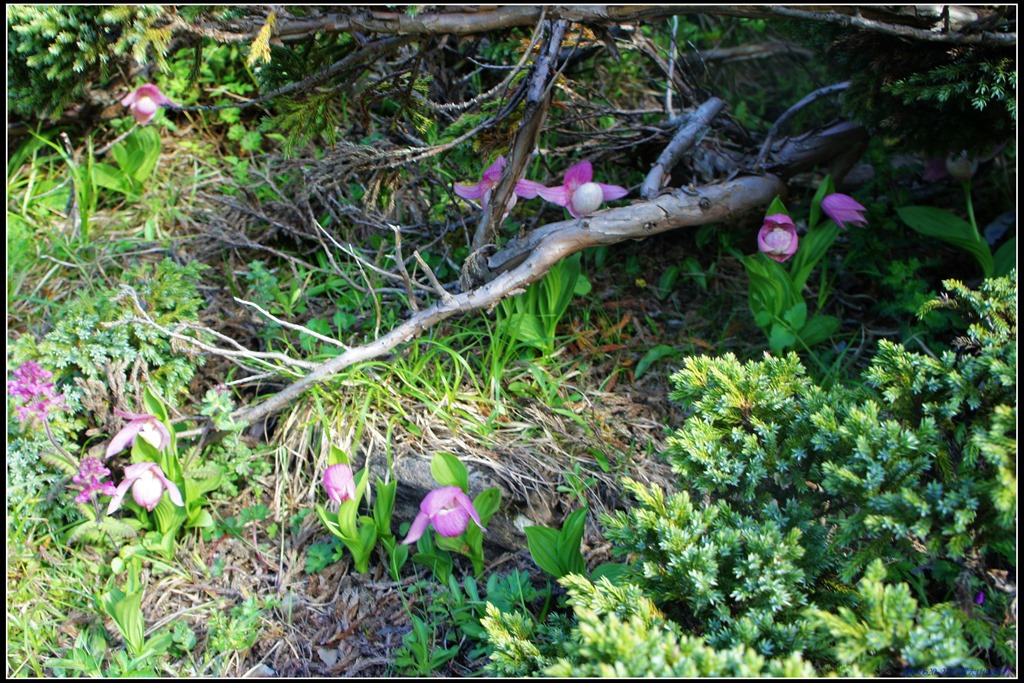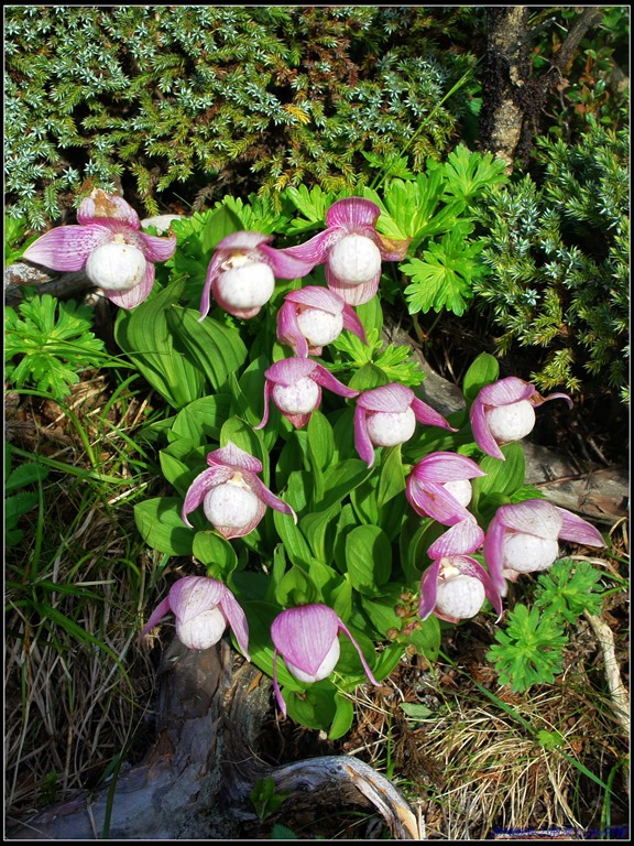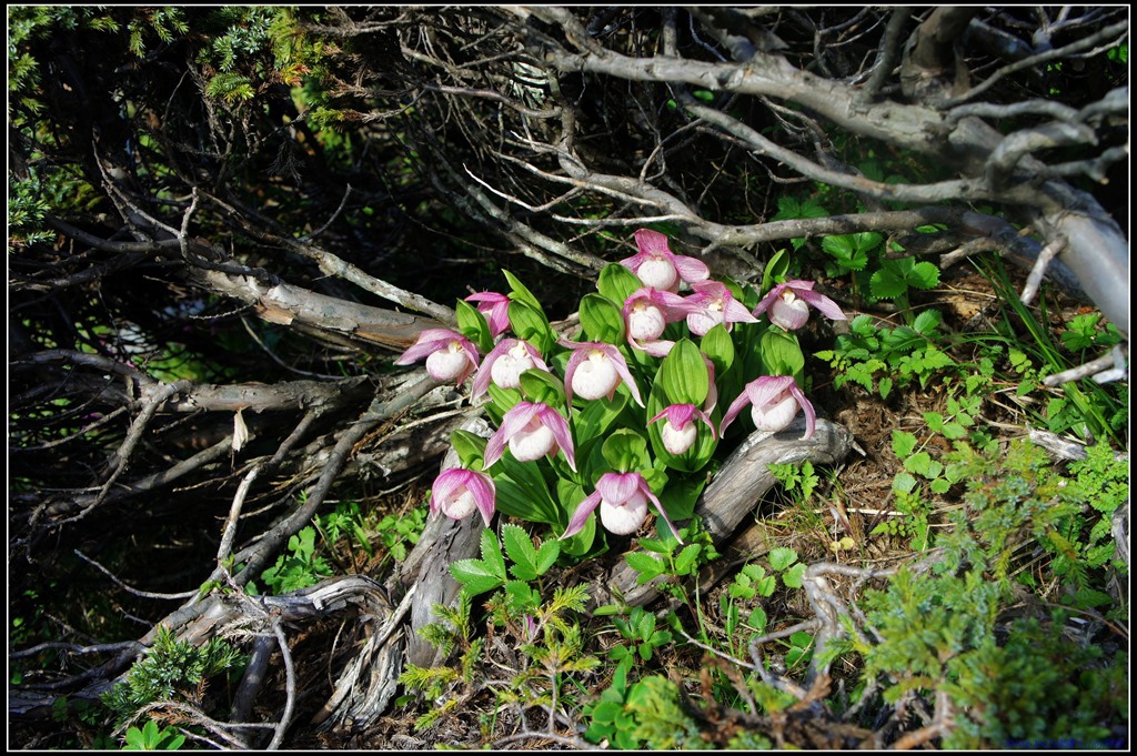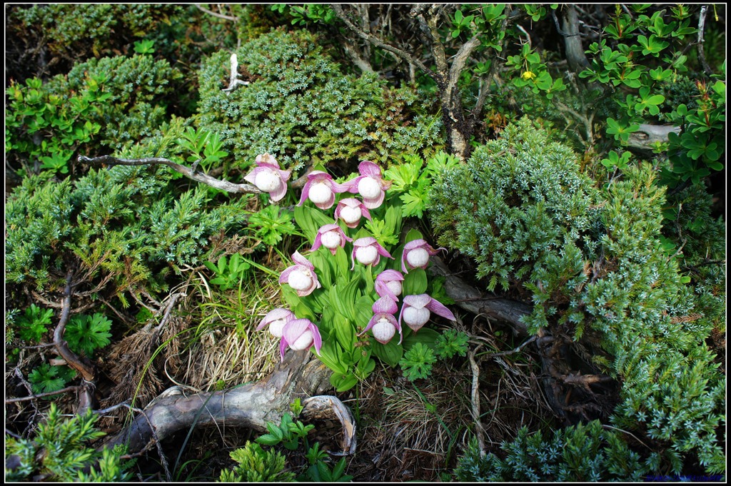 玉山圓柏下盛開的奇萊喜普鞋蘭(13朵及14朵)