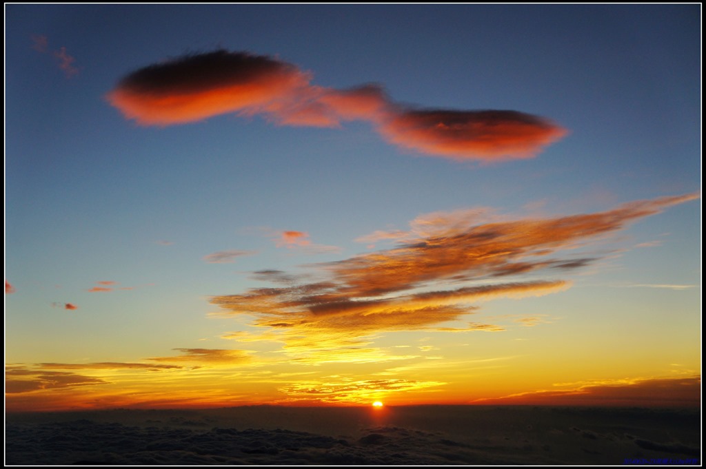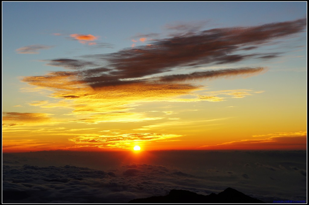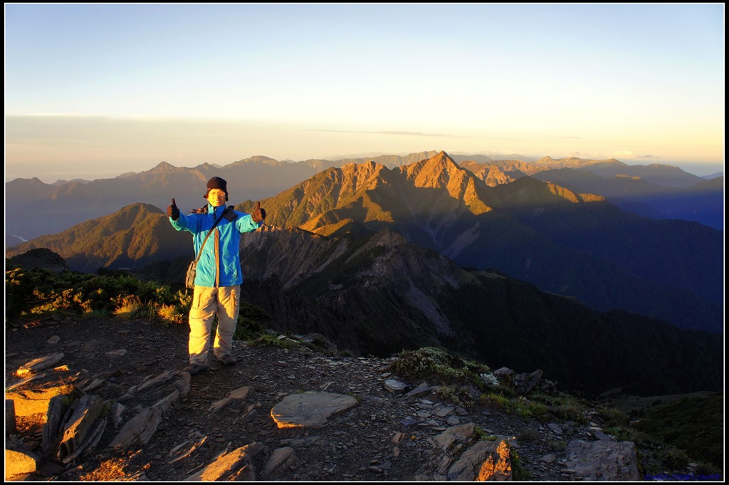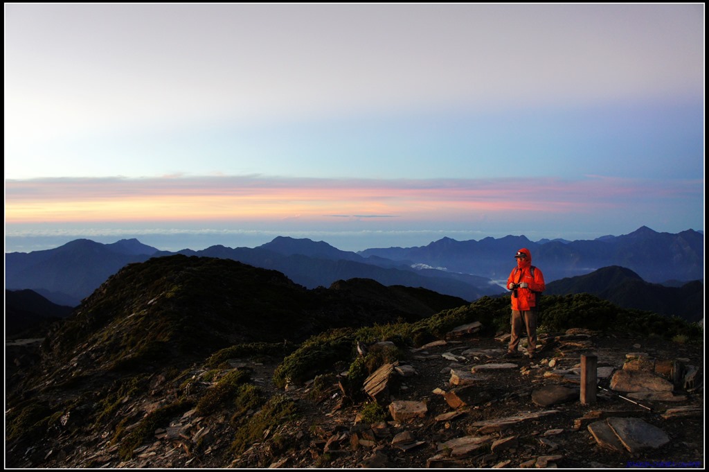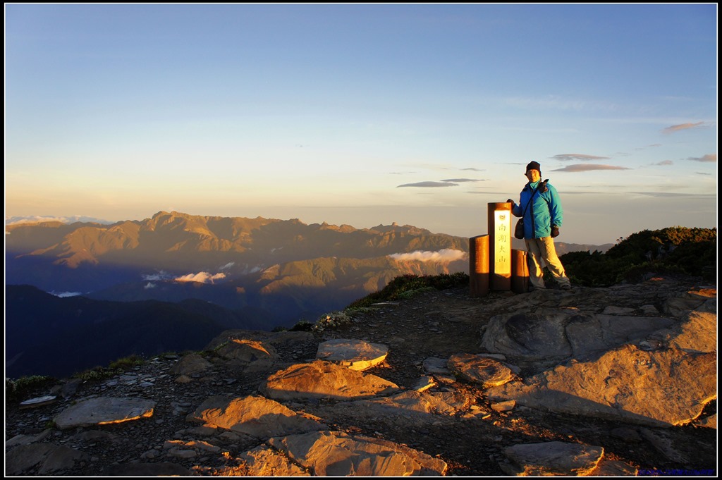 我們約3:10出發前往南湖主峰,4:15至22.6K的攀岩處避風等候,當4:30許東方天際泛起晨曦,我們即朝峰頂前進,約4:40抵達,整個山頭只我和宜峰2人,超讚的。約4:57分許,太陽從漫漫雲海中冉冉升起,隨即綻放光芒,中央尖山、雪霸聖稜線在初陽照耀下,一片金黃,進而翠綠,真是美極了,我們在山頭快意欣賞日出光影變化,約5:35才離開,並在22.4K附近覓尋美麗的奇萊喜普鞋蘭,而且非常幸運,在玉山圓柏樹叢下,遇見2處盛開13朵、14朵的喜普鞋蘭。