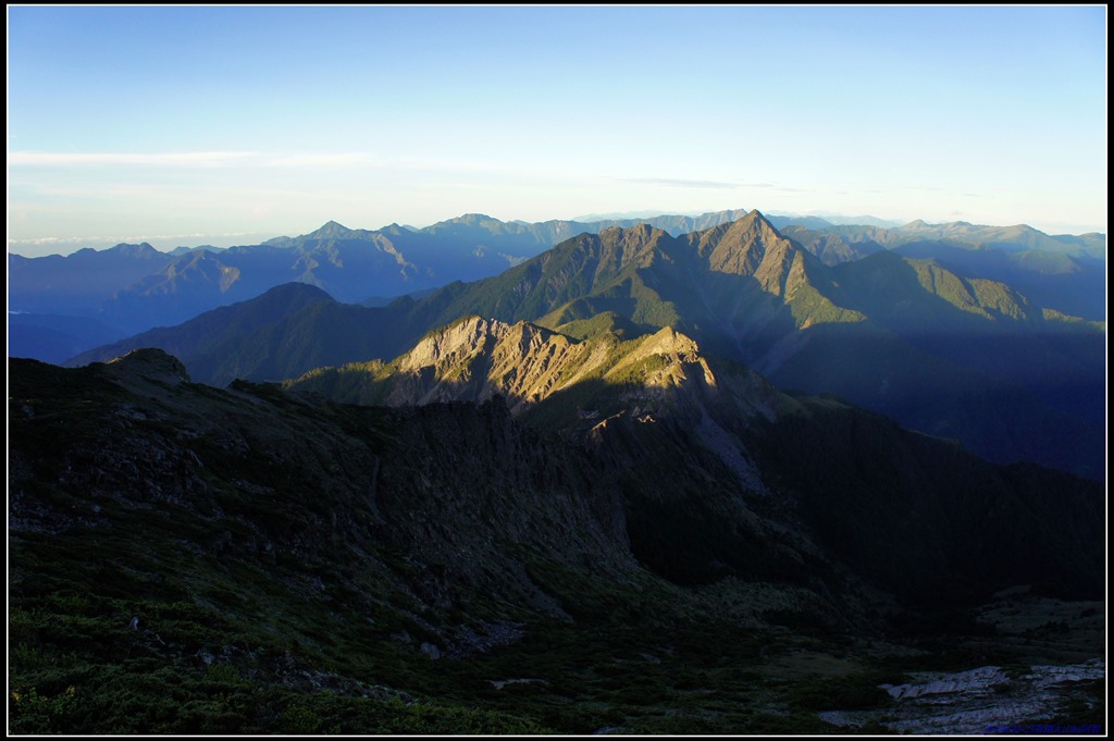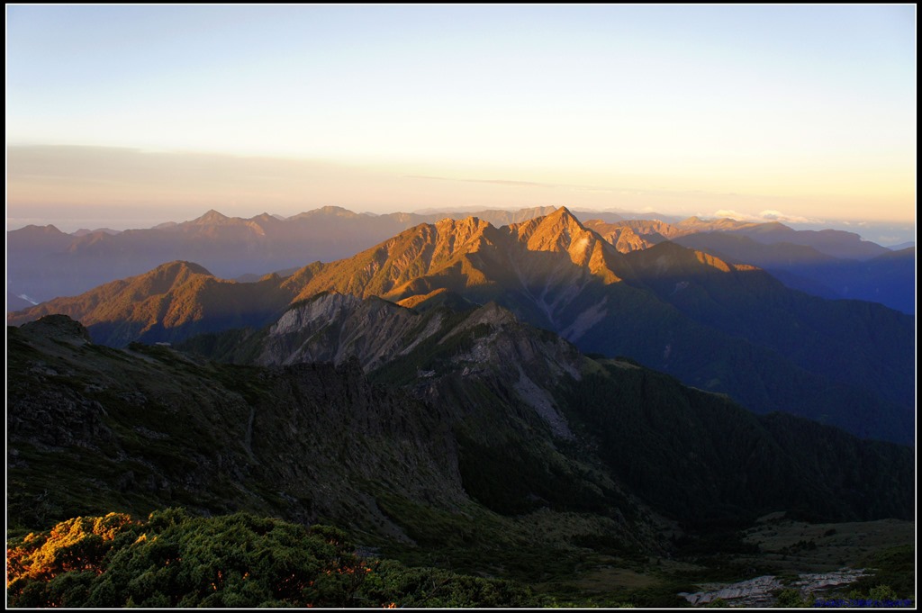 中央尖山、雪霸聖稜線在初陽照耀下,一片金黃,進而翠綠