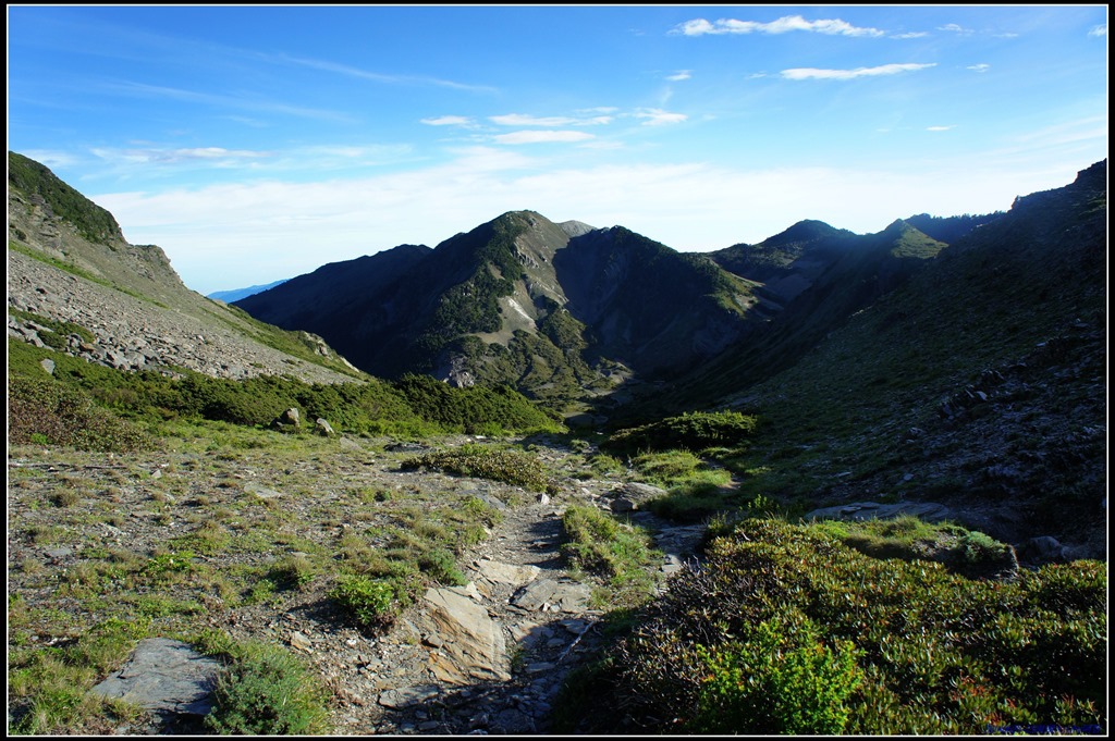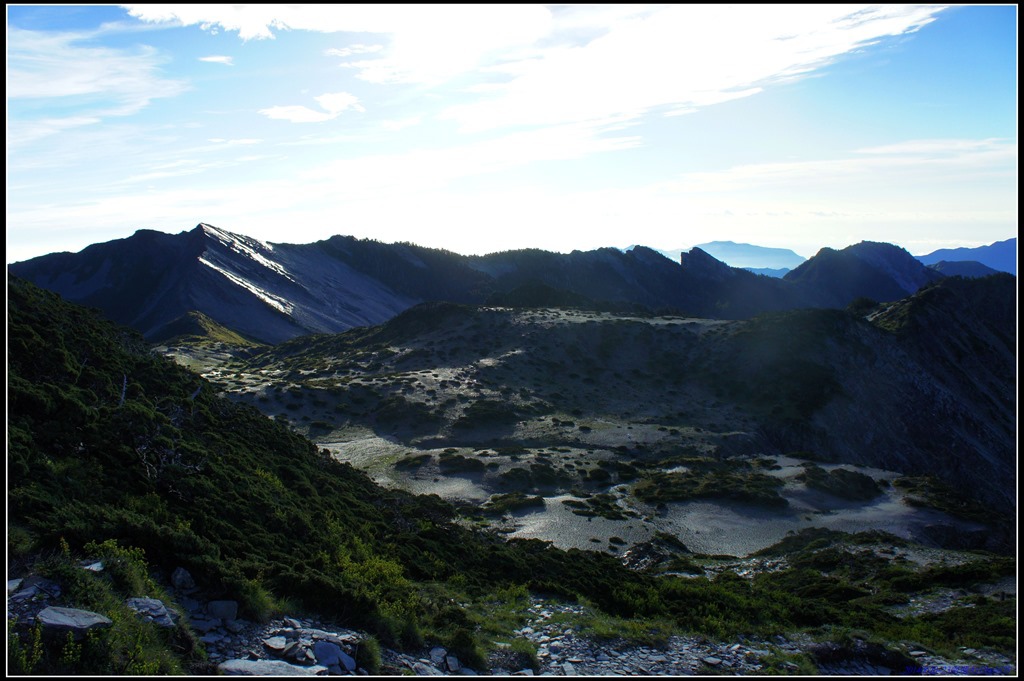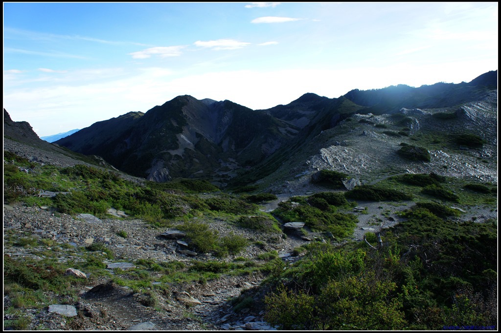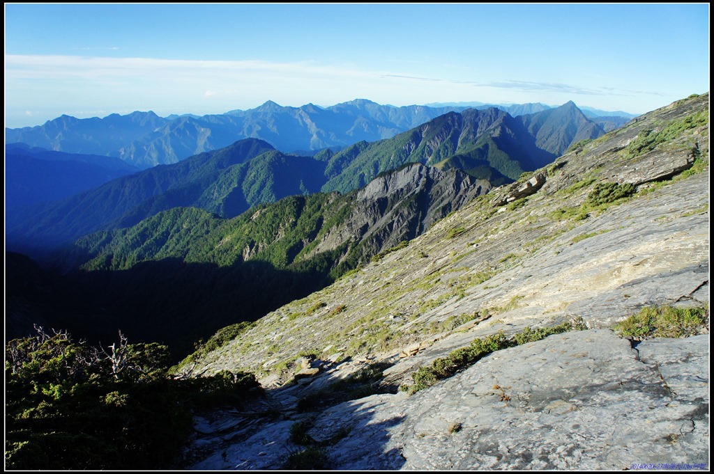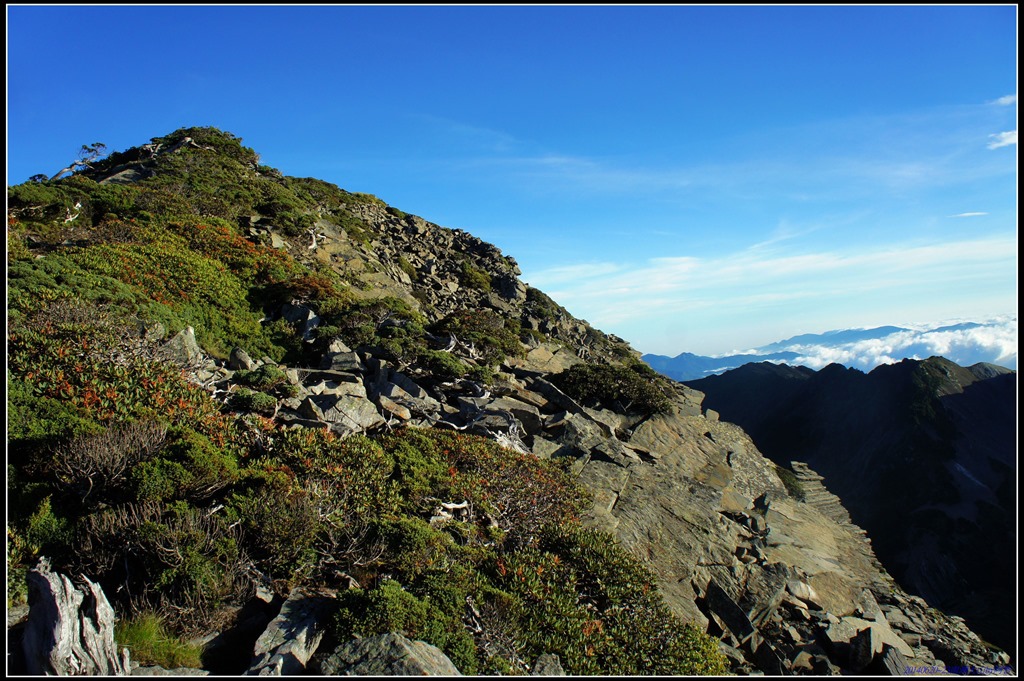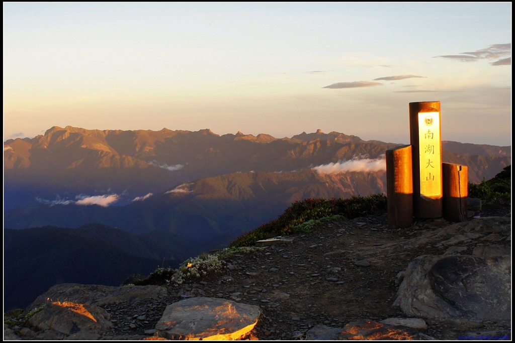 南湖山屋(3:10、21K、3398M )南湖主東鞍部叉路口(22.16K、3565M)南湖主峰(4:40、22.9K、3742M)南湖主東鞍部叉路口(6:40、23.7K、3565M)南湖東峰(7:35、25K、3637M)南湖山屋(9:00、26.6K、3398M)南湖山屋出發(10:25)南湖北峰下圈谷叉路(11:05、27.4K、3604M)雲稜山屋(16:20、35.9K、2605M)
